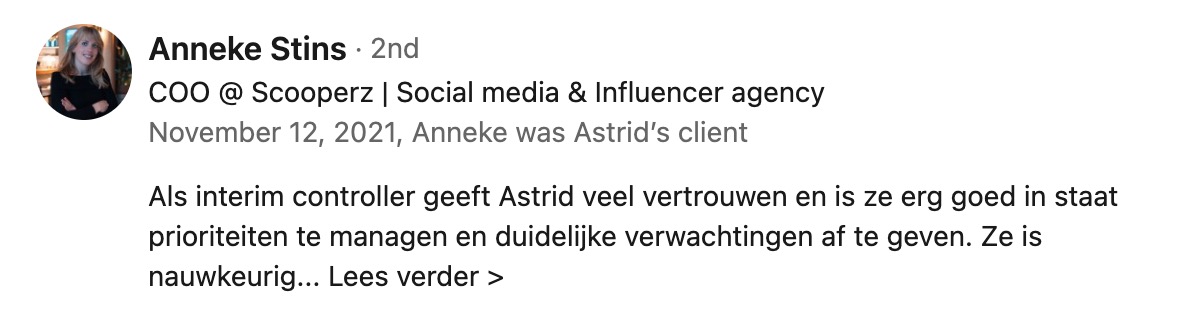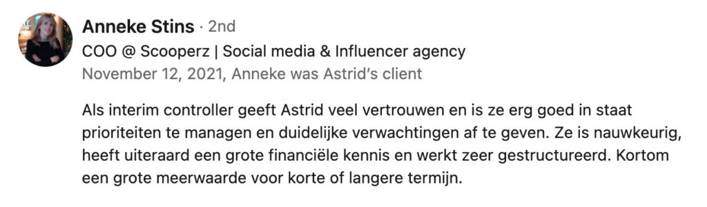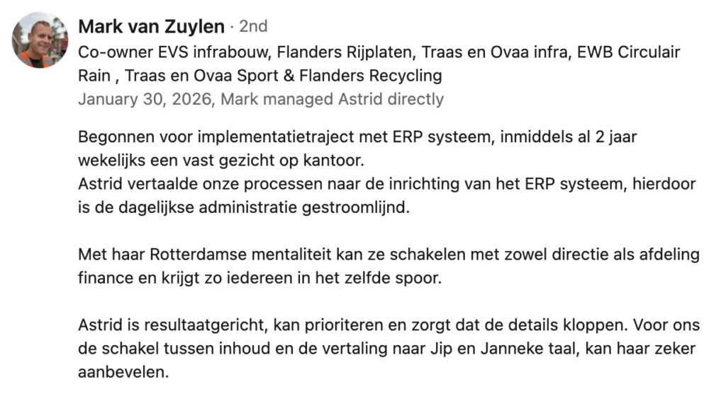 Tijdens mijn loopbaan ben ik betrokken geweest bij trajecten als herfinancieringen, ERP-implementaties, een faillissement en overnames (due diligence) en die brede ervaring zet ik sinds een aantal jaren in als zelfstandige. De afwisseling daarin maakt het voor mij uitdagend; elke organisatie is uniek en vraagt om een passende aanpak. Ik haal dan ook veel energie uit het bedenken van oplossingen en het écht verder helpen van ondernemers!